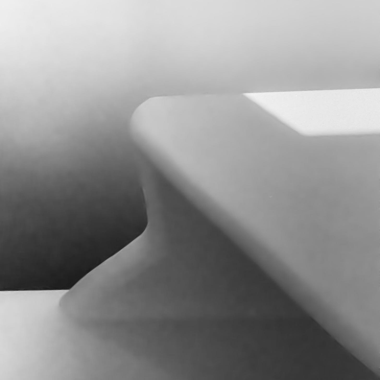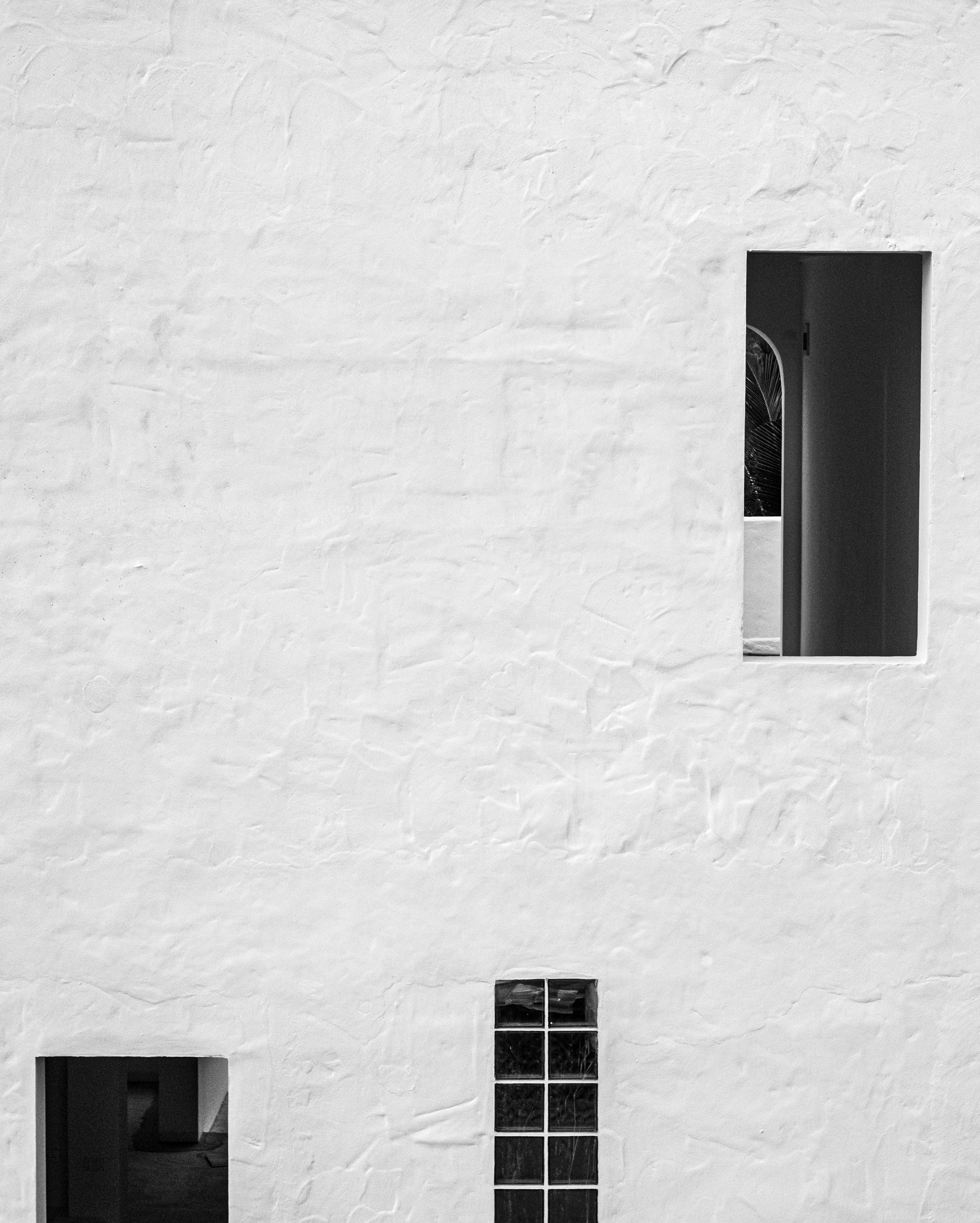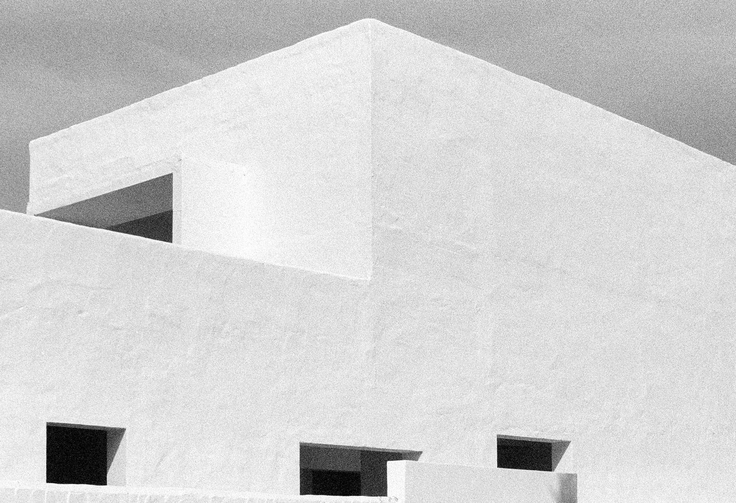 There are a few photos of a building under construction in Thailand with unusual features. A very white, stucco home with contrasting, both very rounded and very sharp features. Photos show some grain as they were taken on film.