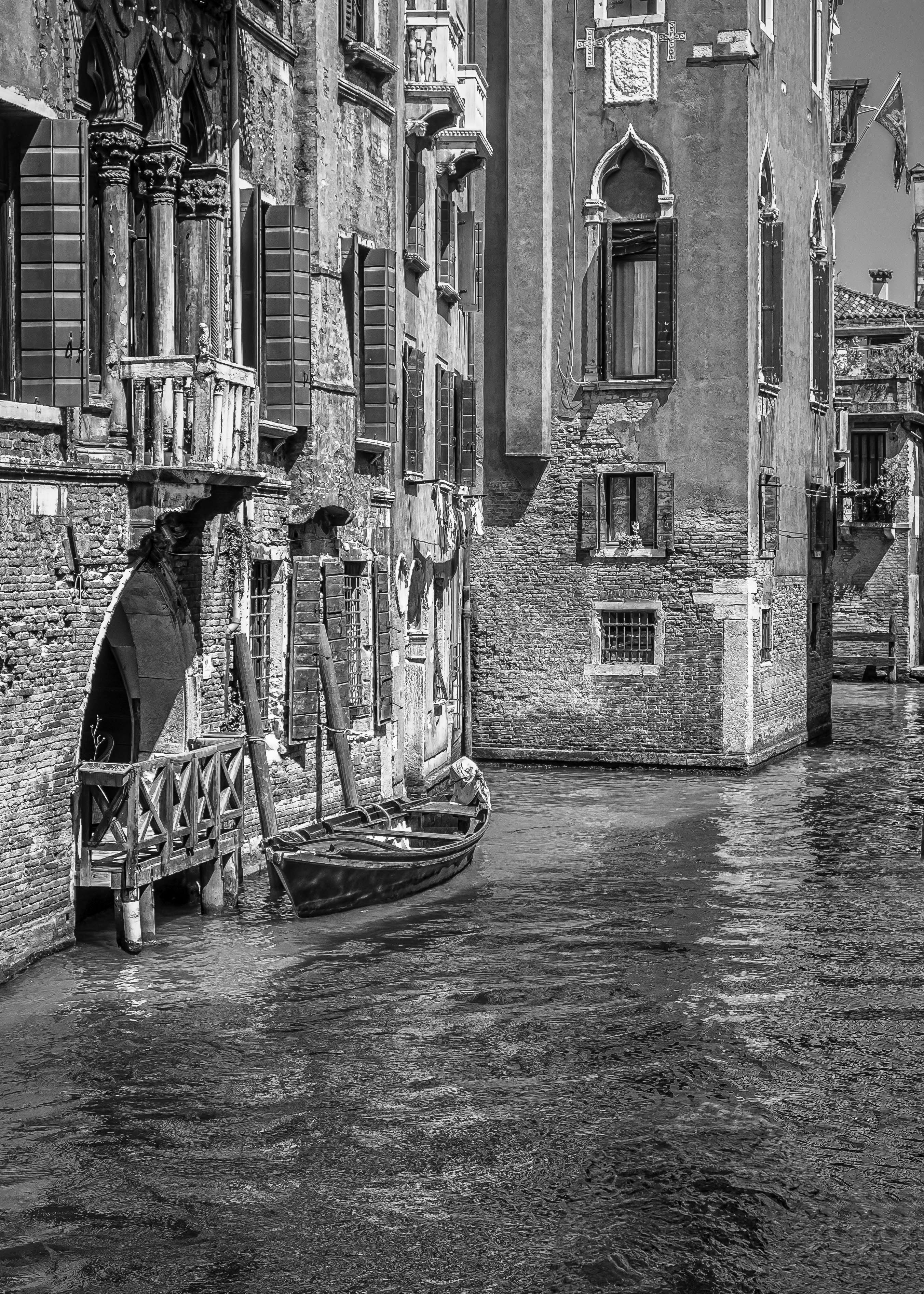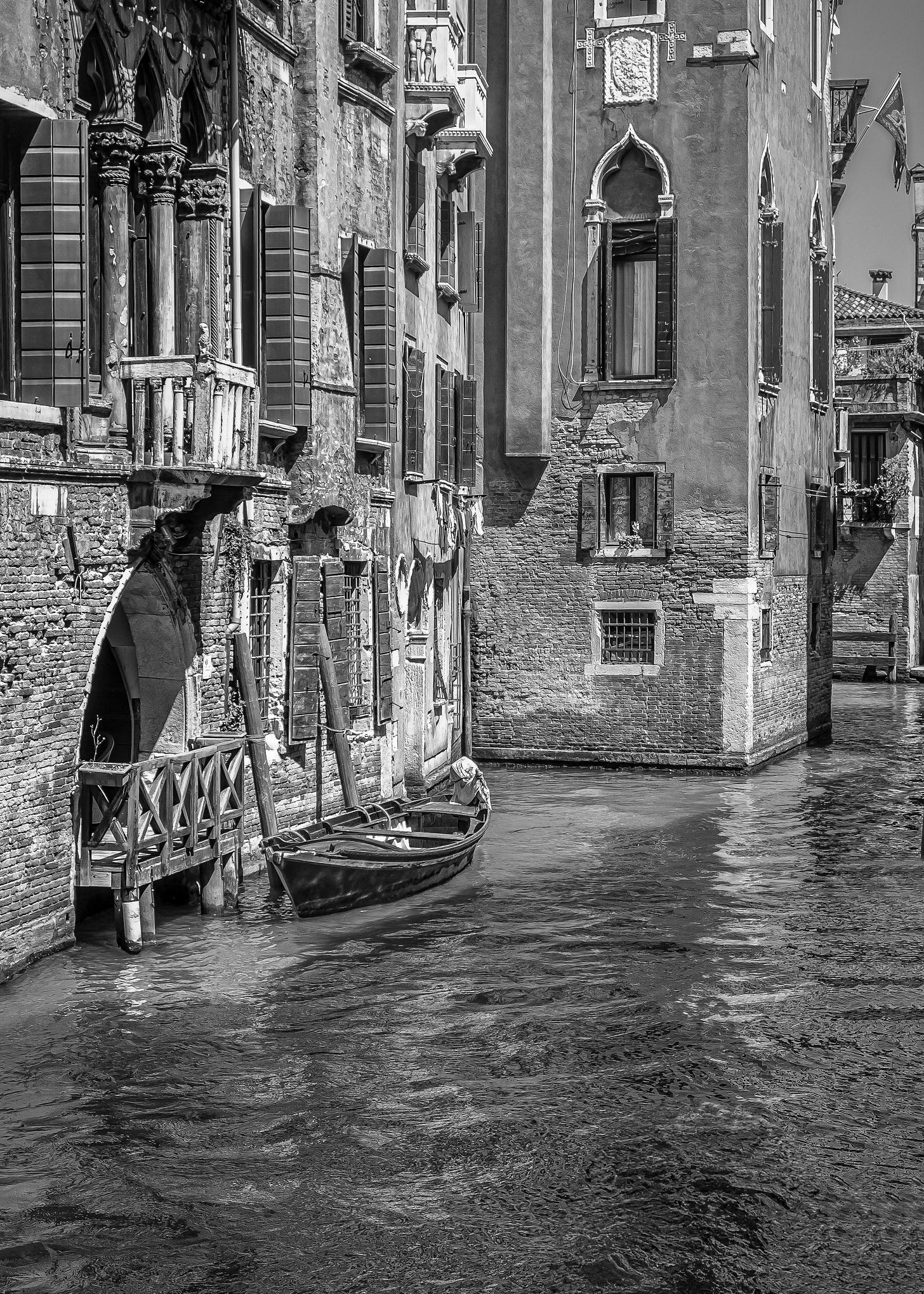Here are views of Venice in black & white. Venice is a colorful city and usually, the photos we see are in vibrant color. But I think B&W allows a different way to view it with a focus on texture, light, and patterns.